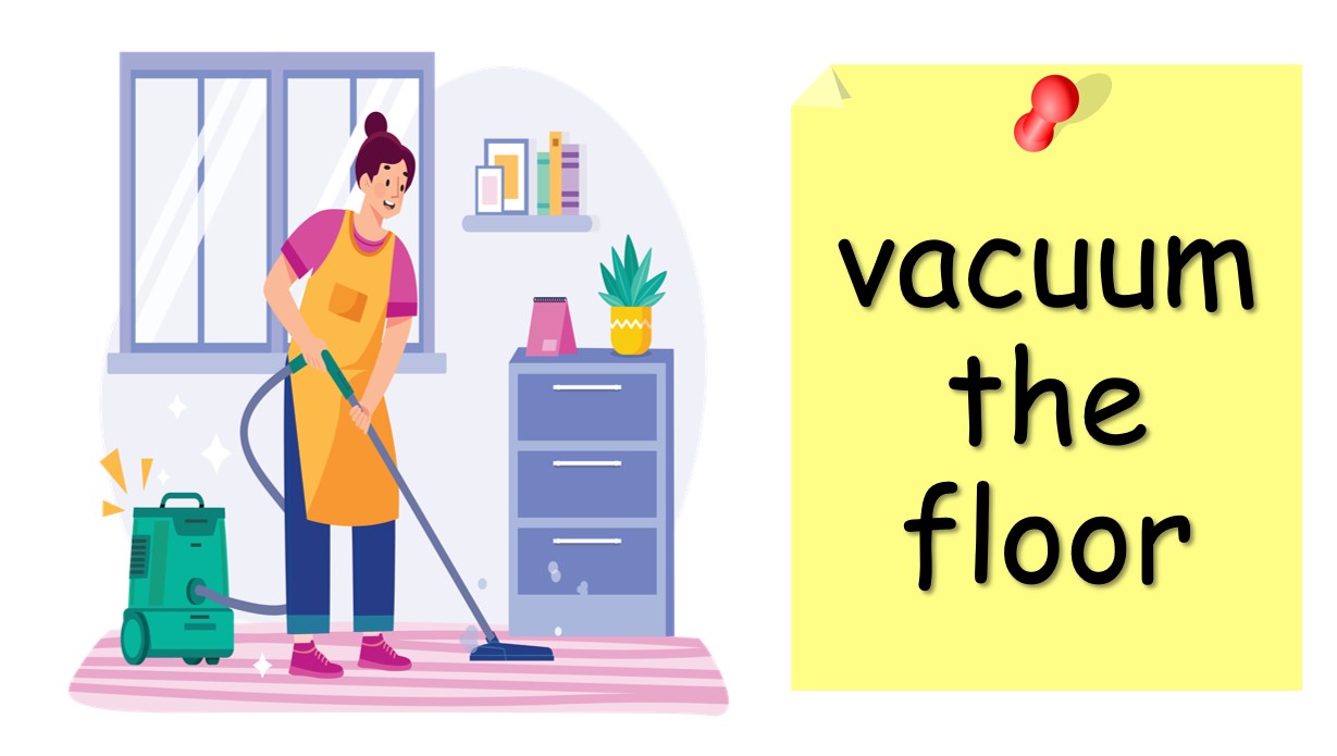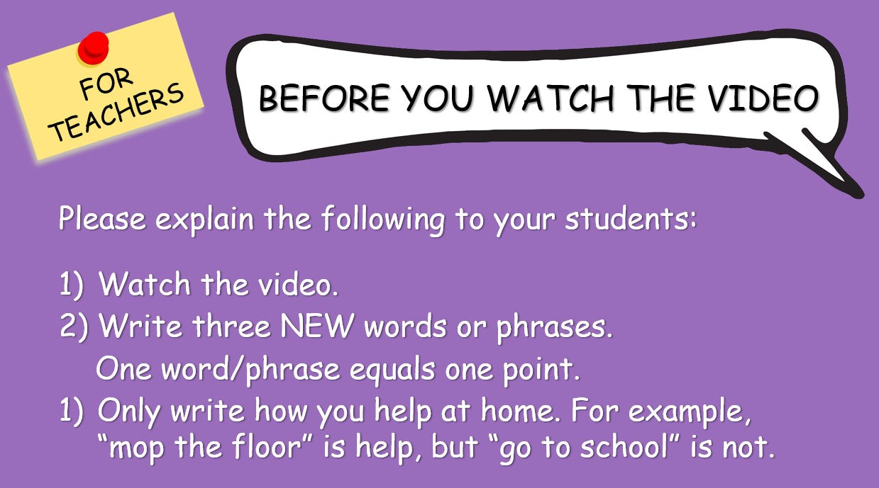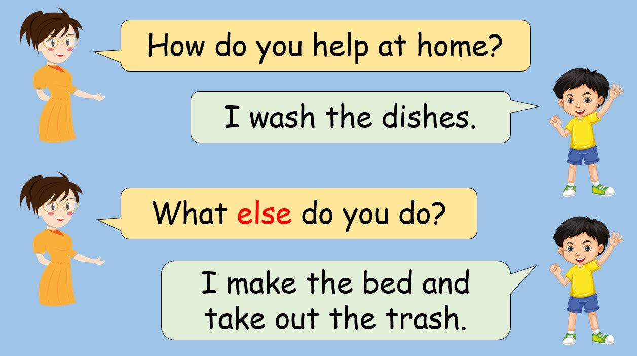 In this ready-to-go ESL lesson, students learn to say, pronounce, and identify six daily routines/household chores (wash the dishes, peel vegetables, water the flowers, make the bed, vacuum the floor, and take out the trash) in conjunction with the following dialogue: "How do you help at home? – I wash the dishes. What else do you do? – I peel vegetables and take out the trash." Suitable for Grades 3-4.